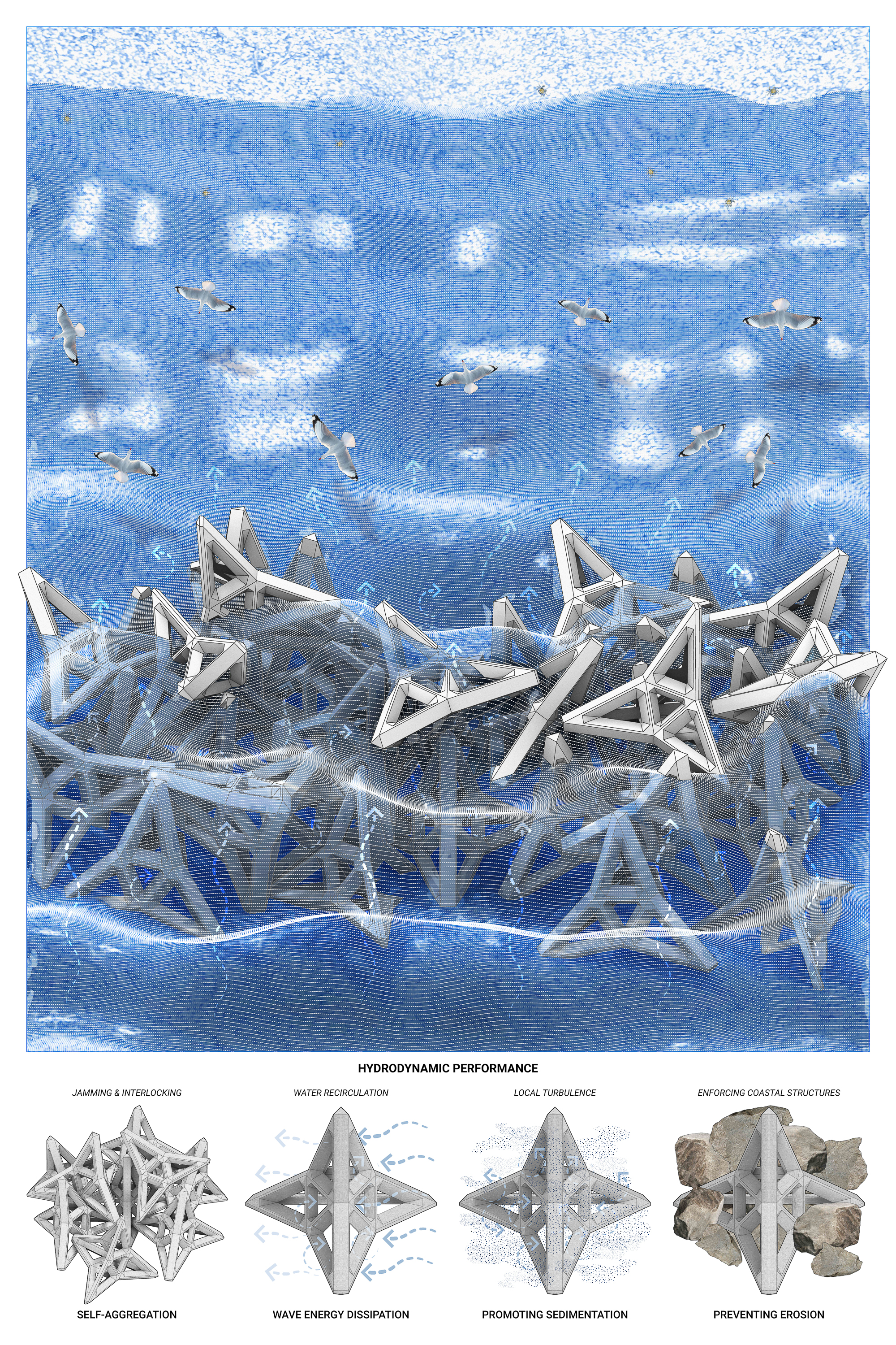 - Tetrahedral Shape for Wave Energy Dissipation: the tetrapod's tetrahedral shape is not only a design feature but also serves as a dynamic solution for wave energy dissipation. By allowing water to flow around rather than against it, the tetrapod efficiently mitigates the tidal forces of incoming waves, showing adaptability to varying wave patterns and intensities.