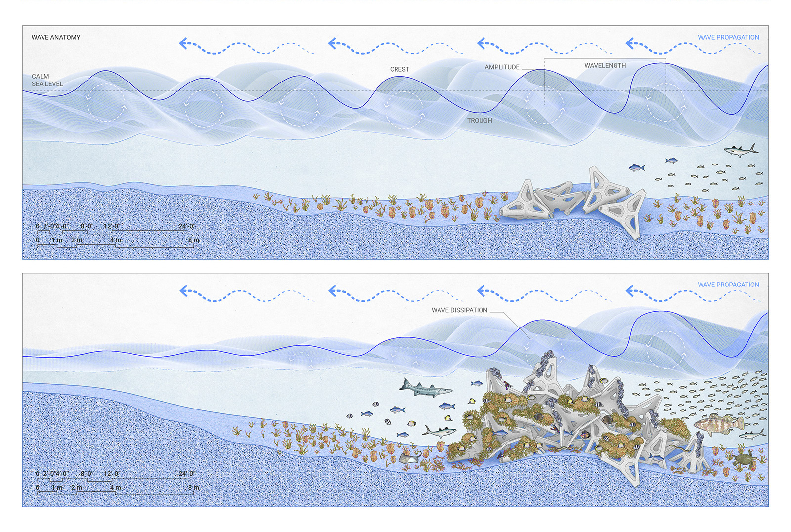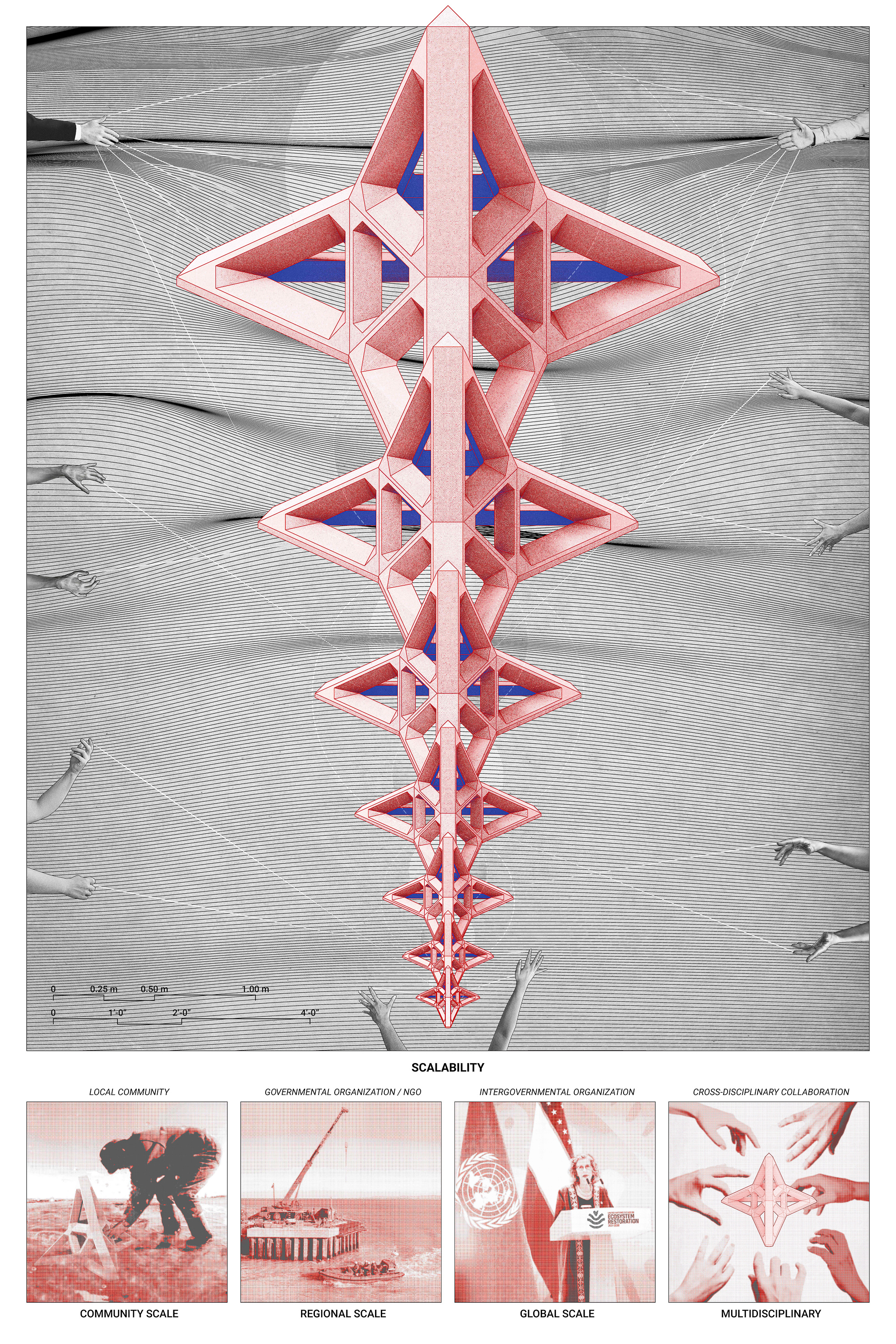 In addition to its physical scalability, the project's potential for policy-oriented partnerships spans multiple scales, offering opportunities for collaboration with global, regional, and community-based organizations. At the global level, partnering with institutions like the United Nations Environment Programme (UNEP), the World Wildlife Fund (WWF), and the Global Coral Reef Alliance can provide invaluable support and advocacy for coastal protection initiatives. Regionally, engagement with governmental organizations such as the National Oceanic and Atmospheric Administration (NOAA), Climate Action Funds, and Green Climate Funds can facilitate regional coordination and funding opportunities. At the community level, collaborations with local organizations such as the Coral Restoration Foundation, Coral Guardian, and Ocean Conservancy can harness local expertise and community engagement for project implementation and impact.