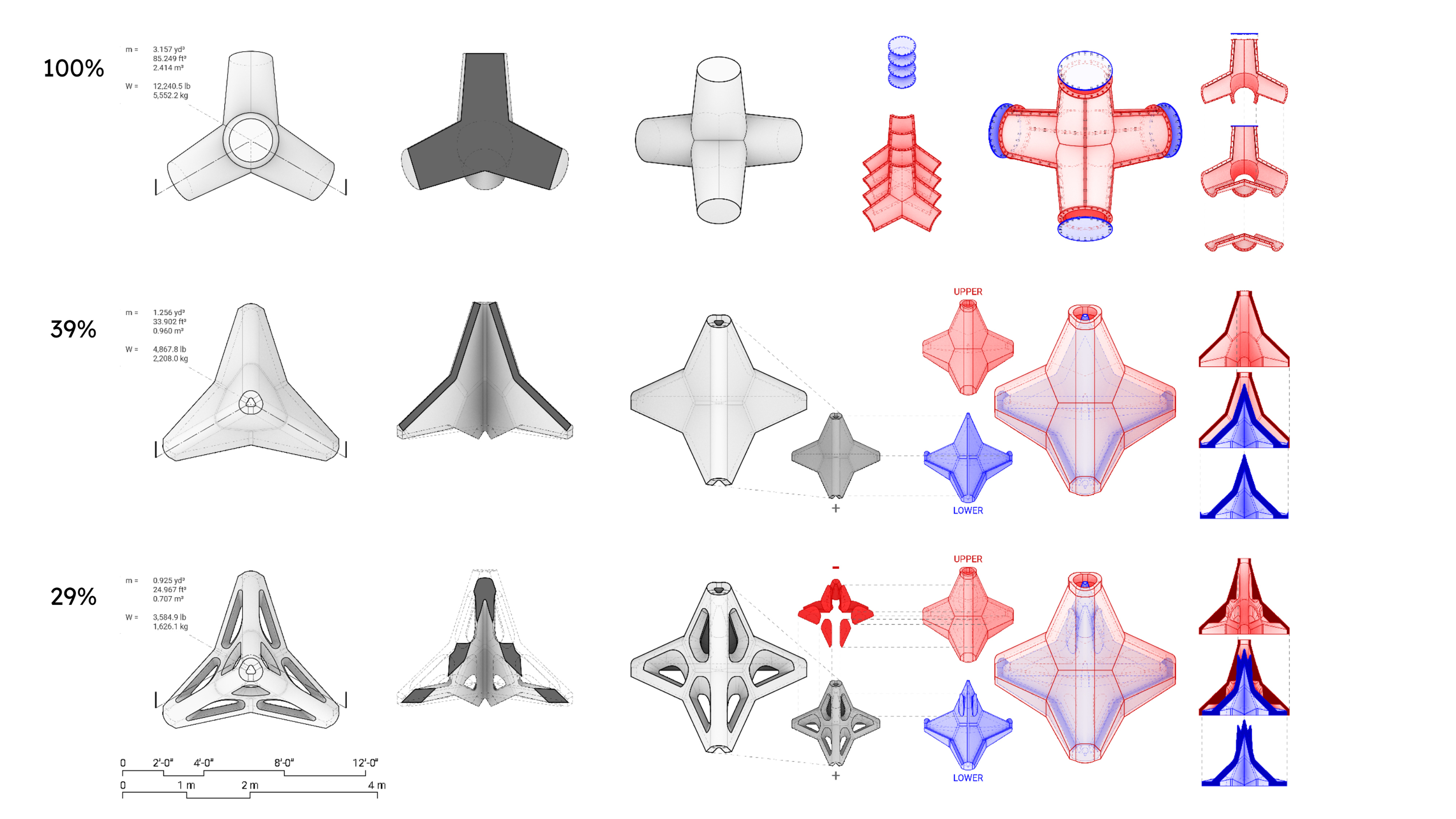 Additionally, the refined design significantly reduces the mass and weight of the tetrapod structure. Comparing it to the original, the refined design constitutes approximately 39% of the original mass. With the presence of voids factored in, the mass further diminishes to just approximately 29% of the original. This reduction in material usage results in a smaller carbon footprint, lower thermal mass, decreased energy consumption, enhanced mobility, and other positive environmental implications.