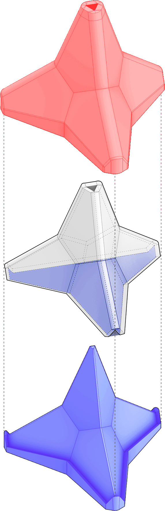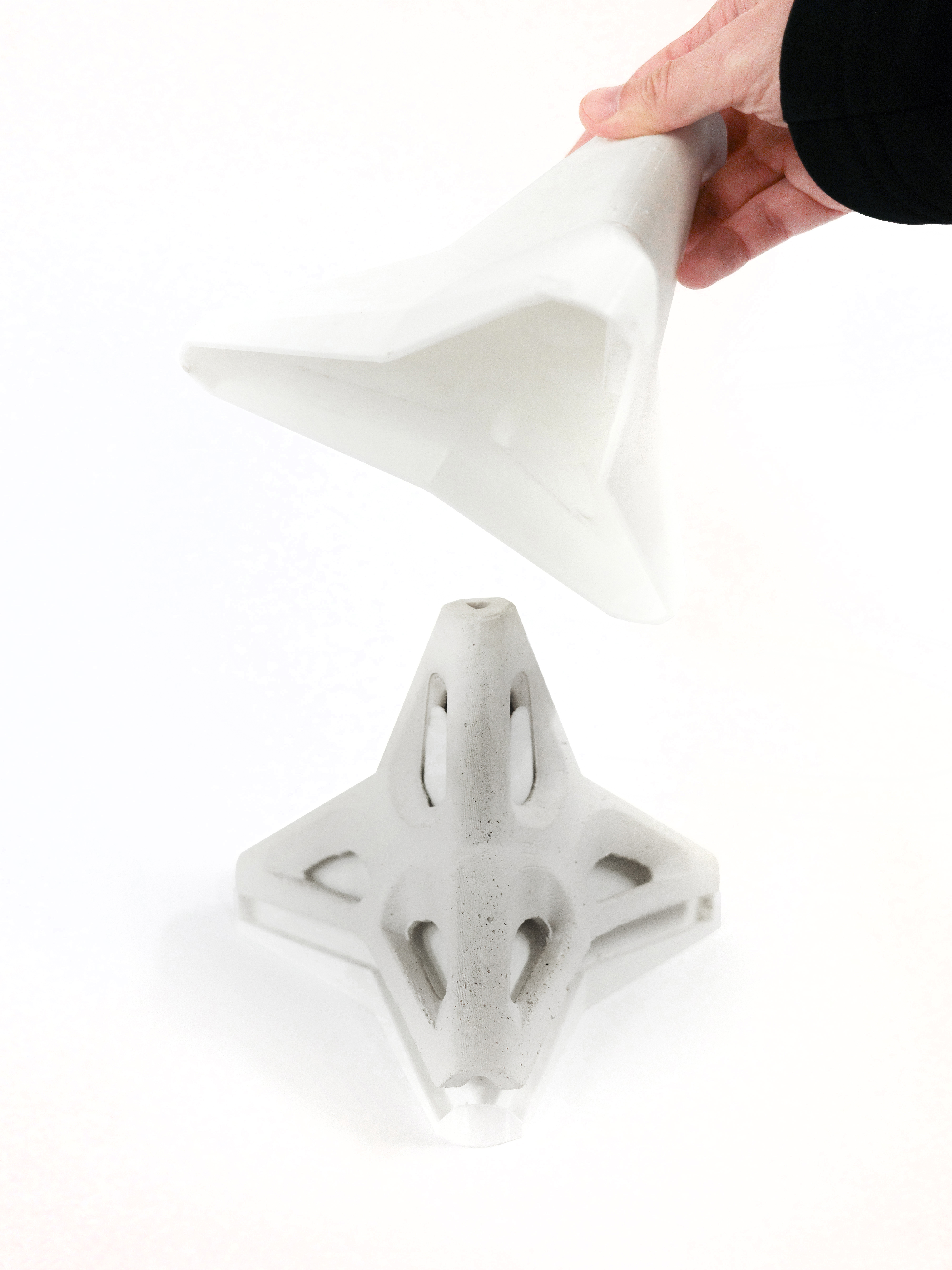 Additionally, the design refinement process aimed to enable mold fabrication while preserving the key features of the original tetrapod design. The modification using a two-part mold will allow for casting with a reduced mold complexity from eight to two parts. This efficient fabrication method will also enhance scalability and minimize energy consumption.