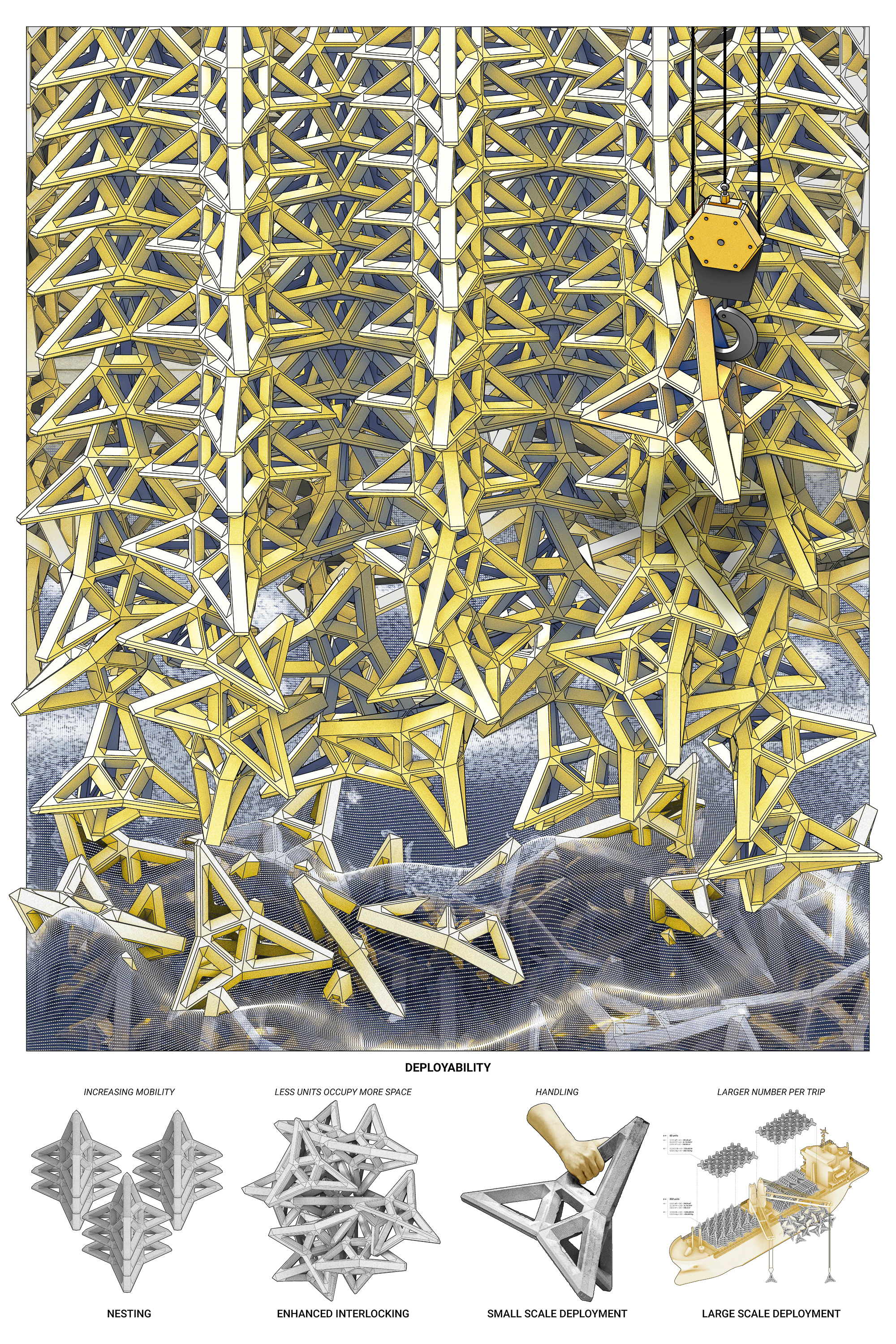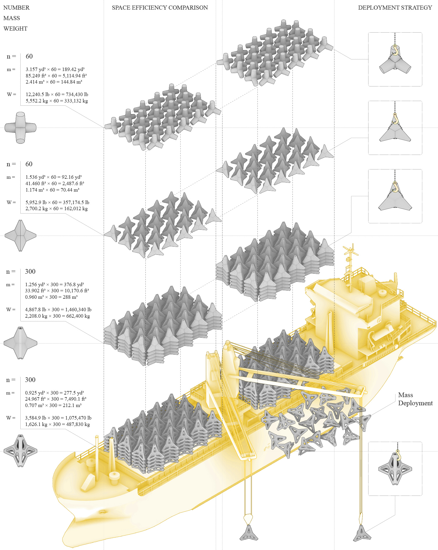 In assessing mobility and deployability, the refined design of tetrapods exhibits significant advantages when considering transportation on ships. When accounting for the same volume occupied by tetrapods, the refined design allows for the delivery of up to five times more units in a single trip compared to the designs at the top. This increased efficiency is attributed to the voids in the tetrapod structure, facilitating easier deployment. Unlike the original designs that require a cable or an embedded hook in the tetrapod for component transportation during deployment, the latest design can be effortlessly carried using only a hook from a crane. Additionally, the refined design opens avenues for implementing mass deployment strategies, further enhancing the overall efficiency and versatility of the tetrapod transportation process.