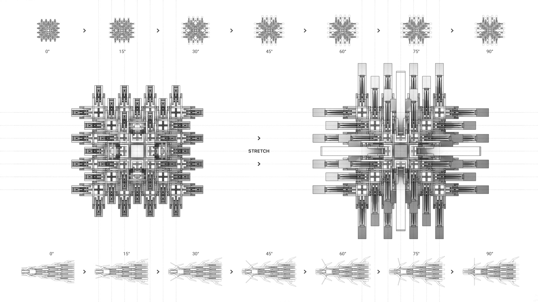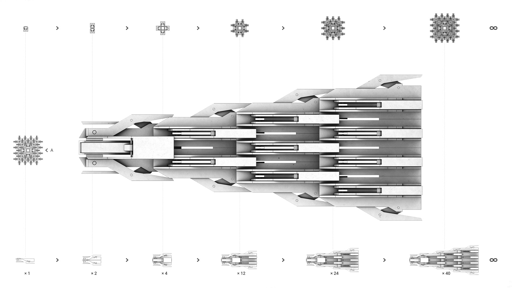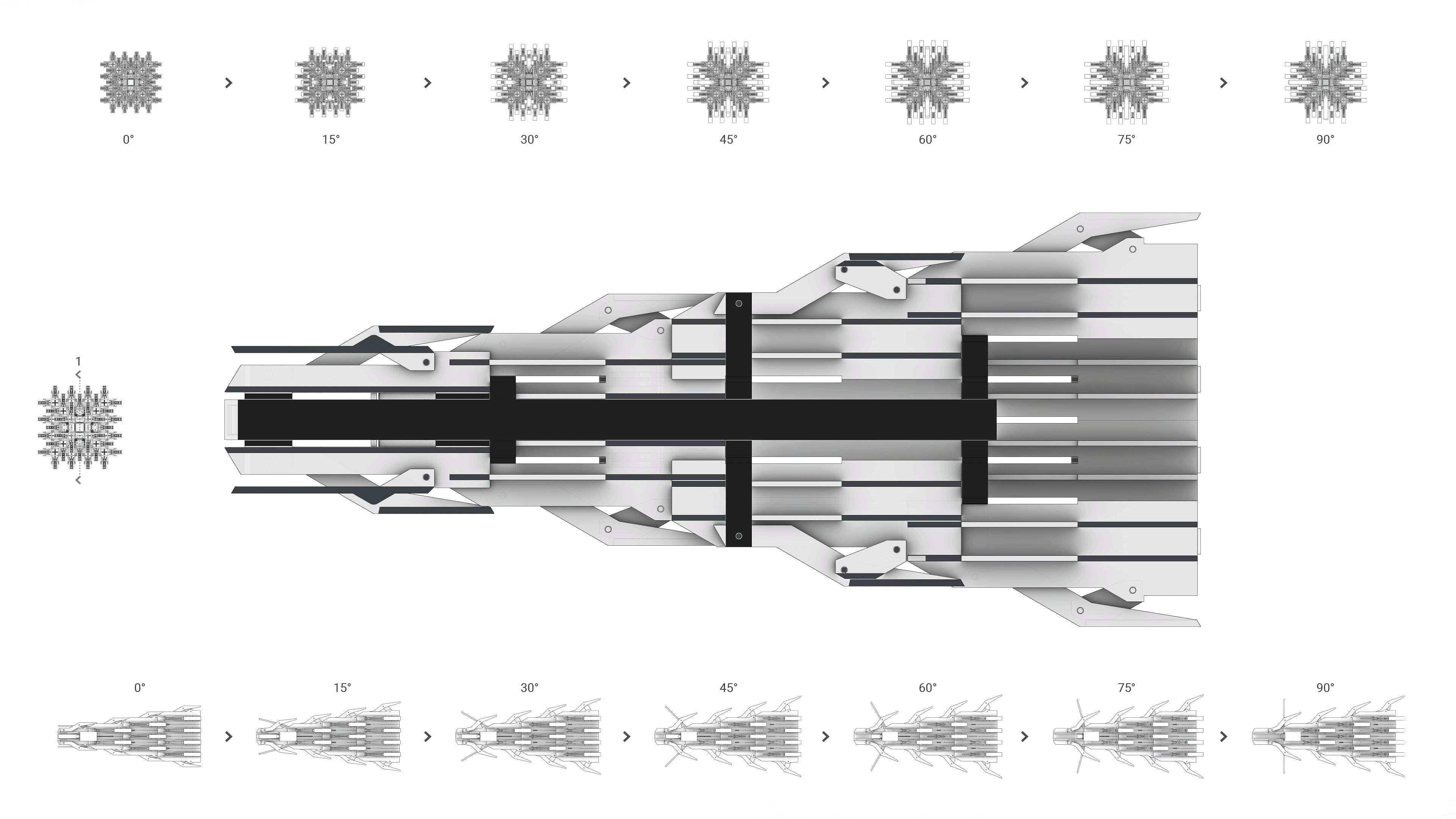 As a pliers-type stapler is the selected object, its mechanism is developed by duplication. The mechanism originally has a moving part and rotating parts. The moving part has 1-axis movement, thus it is used as a "moving core" in the developed system. Meanwhile, the rotating parts are duplicated by expanding the modules and connecting to the "moving core". As a result, the system could be infinitely expanded under this mechanical pattern.