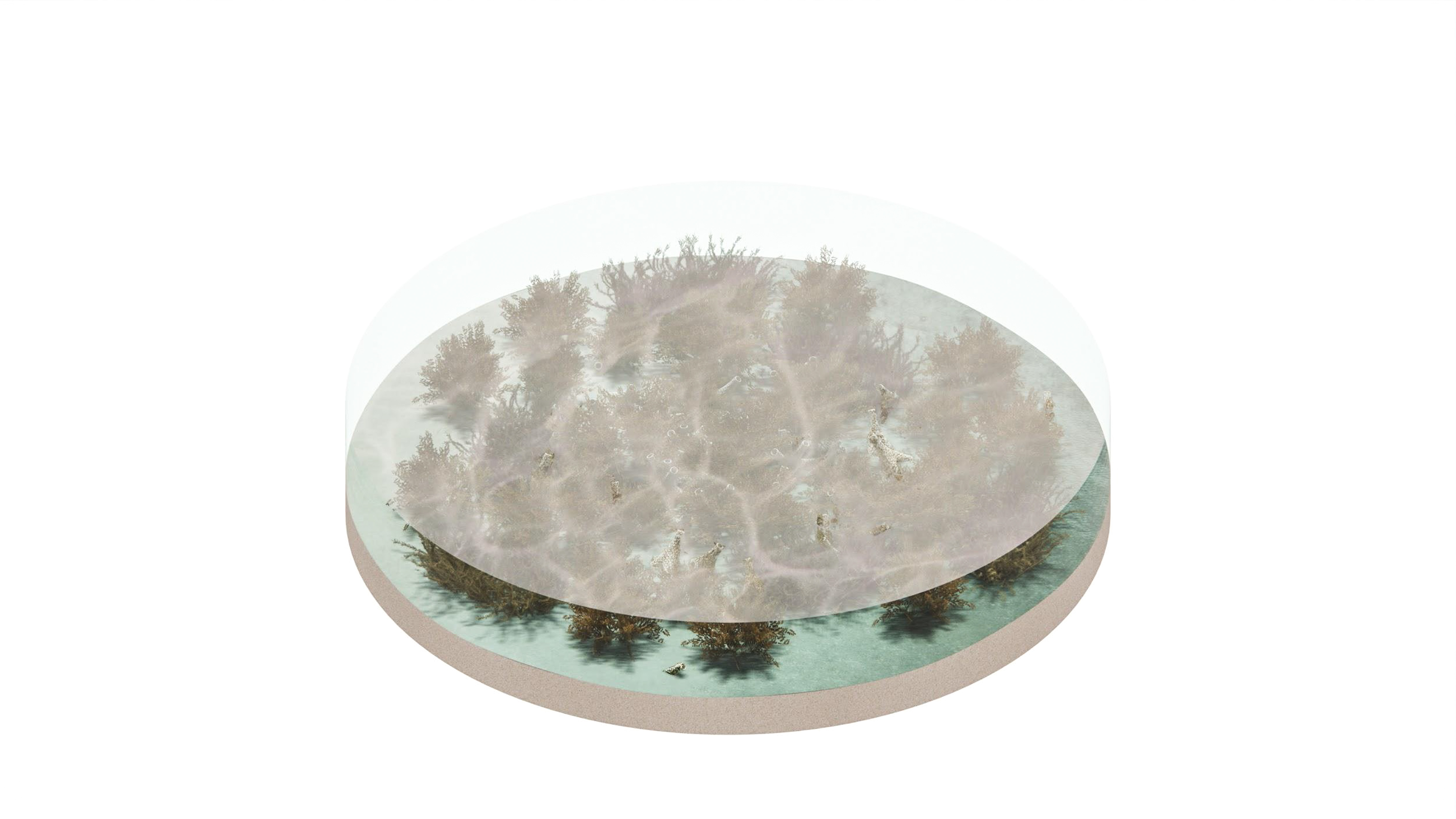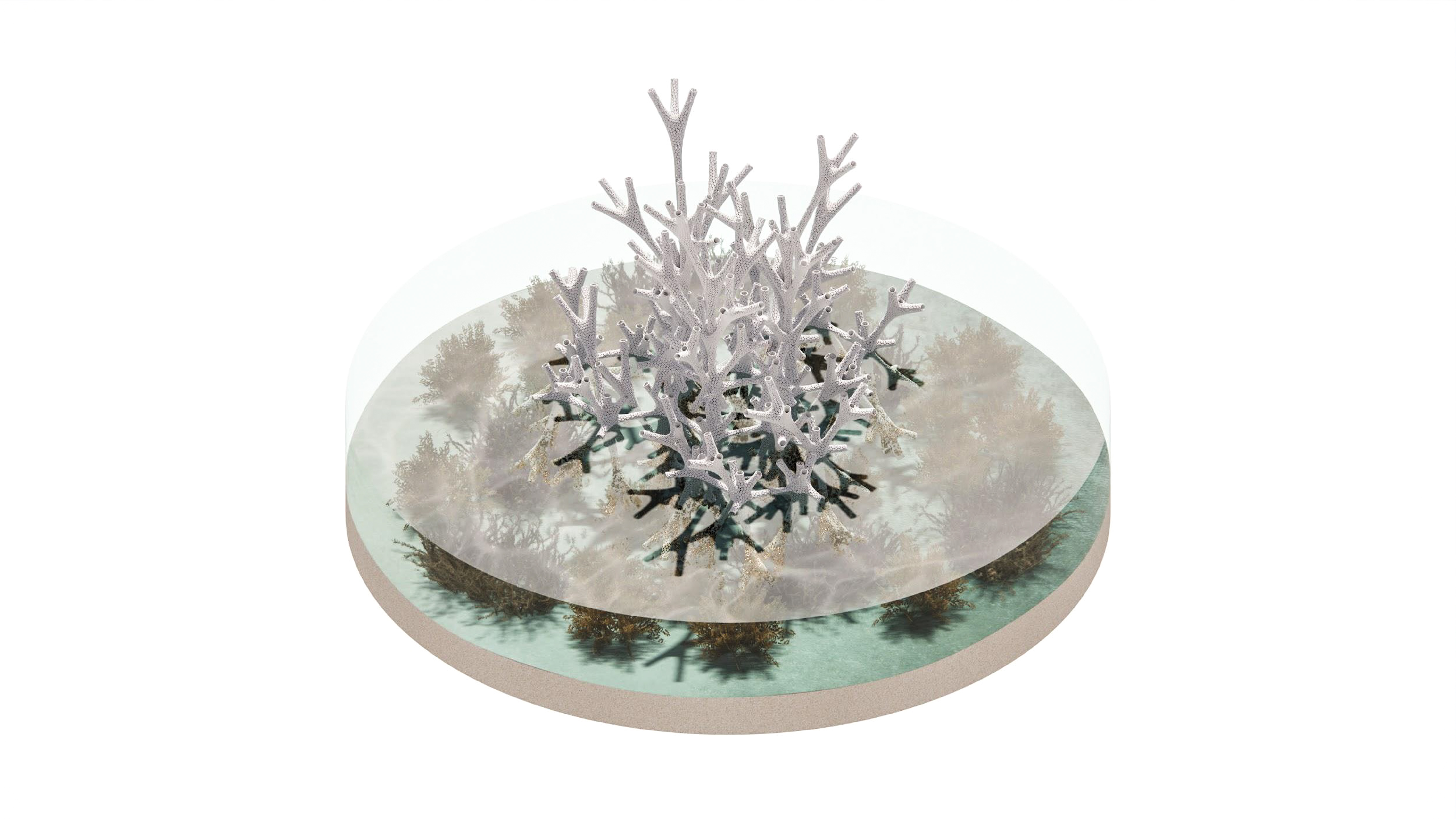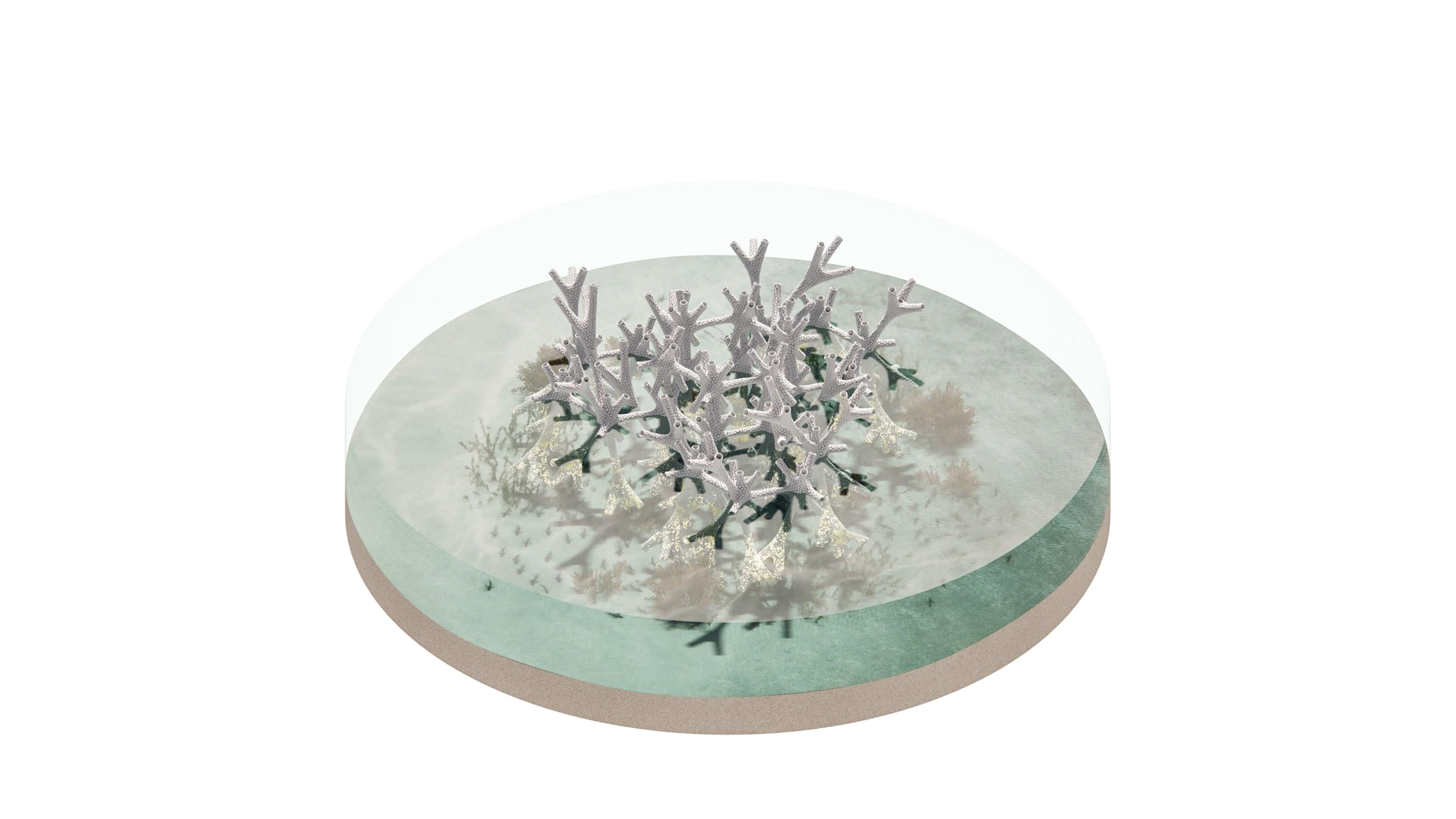 The intervention involves placing a hexagonal grid as a foundational structure, expanding it, and adding branches for stability. These components provide a substrate for coral polyps to attach and grow, both above and below the water level. Underwater, the branches work to restore the coral reef ecosystem. Meanwhile, amphibious sections host barnacles, serving as a water purification system and contributing to the marine food chain. At the top, seabirds perch, contributing to the ecosystem through their droppings.