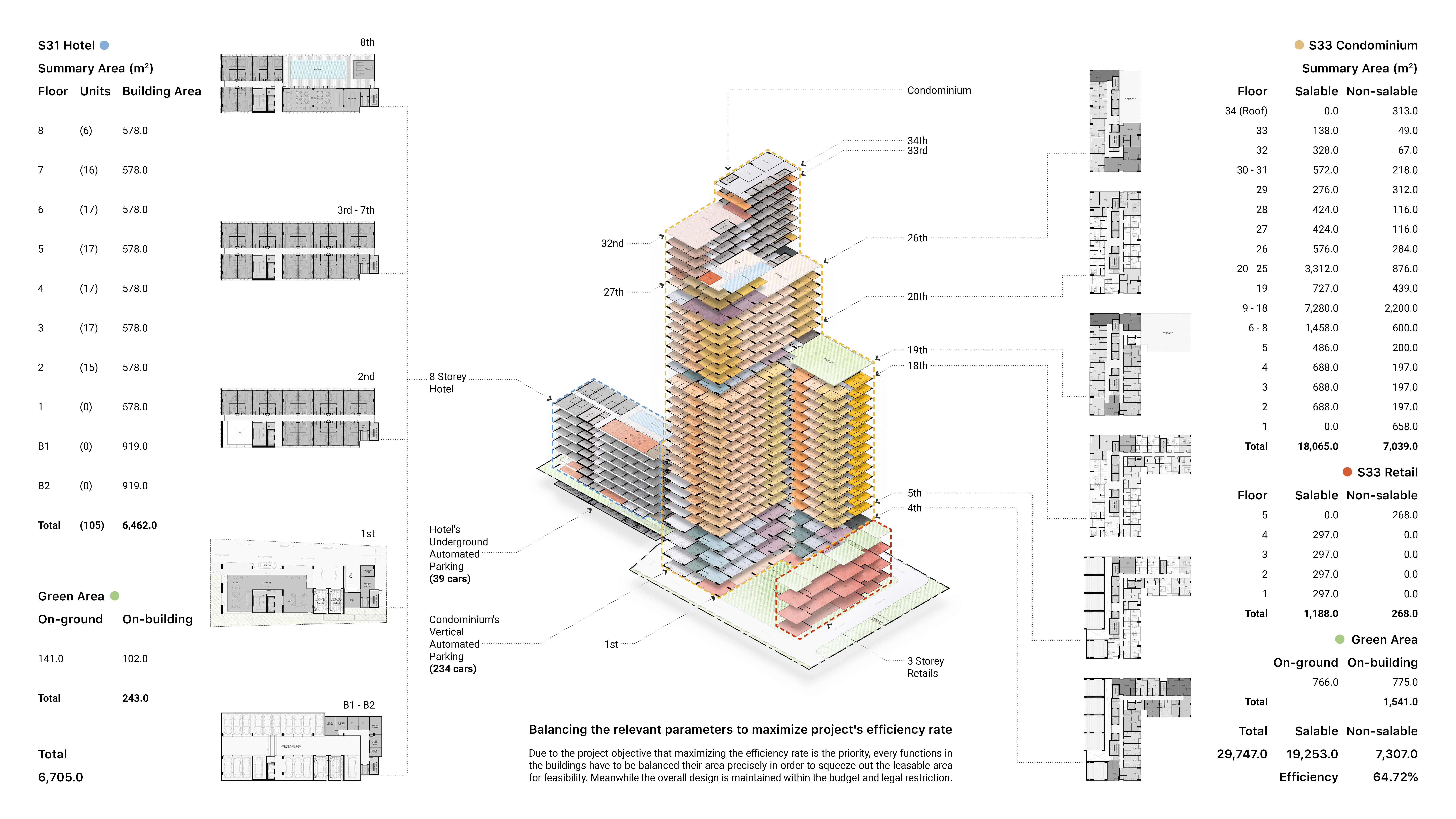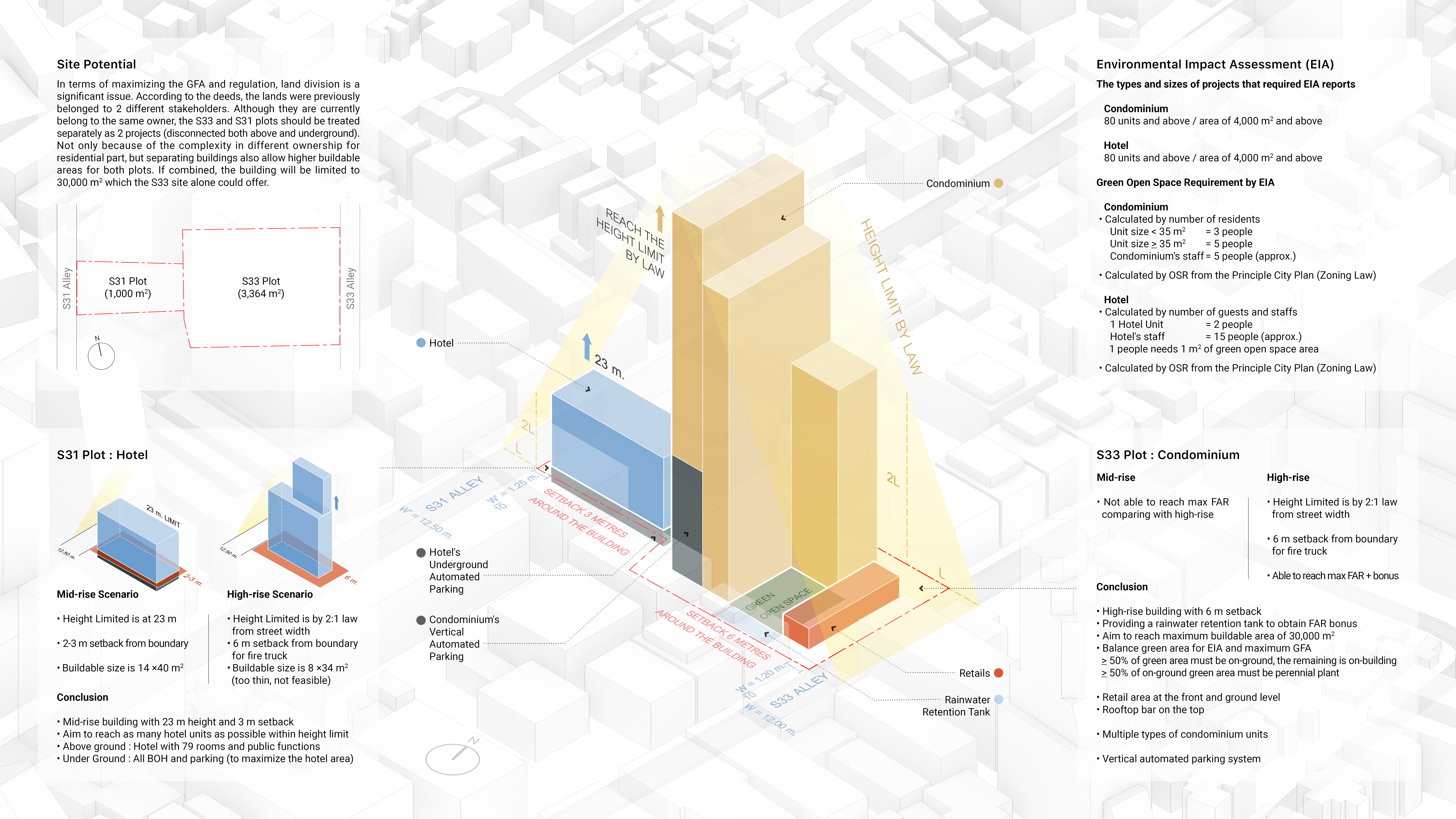 The project's scope is to study the feasibility of new buildings and find the balance between residential, hotel, and retail areas. To explore the extent to which the property could benefit, the main criteria involve maximizing the Gross Floor Area (GFA) at FAR = 8:1 and achieving a 20% bonus GFA by incorporating a rainwater retention tank in accordance with regulations. Automated parking systems are applied to the design to reduce the legally required area for parking lots and substitute it with increased leasable area.
